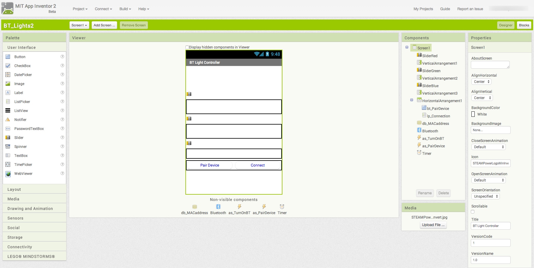 Okay, let’s log in to App Inventor. We start in the Designer mode to create our UI. I found this wonderful tutorial from Luis Picarzo on using Bluetooth and App Inventor, which formed the basis for this project. Code re-use! Another win for open source! For this project, I will use 3 sliders to control the intensity of each of the colors (Red, Green, Blue) of my LED strand. By mixing different values of color intensity, I can create quite a few different colors, just like pixels in your television, smartphone display, or computer monitor. I will also need to add some buttons to enable actions such as the Bluetooth pairing of my devices, establishing a Bluetooth connection, and disconnecting when I am done. There are also 5 non-visible components that need to be added to enable the functionality we are seeking. Non-visible components are the “behind-the scenes” parts of an app that the user interacts with indirectly, as compared to visible components such as buttons, sliders, and text fields. These non-visible components include TinyDB, Bluetooth Client, two Activity Starters, and a Timer. I also tweaked some UI settings such as shading each slider bar with the color it represents. When you are done, you will have this: